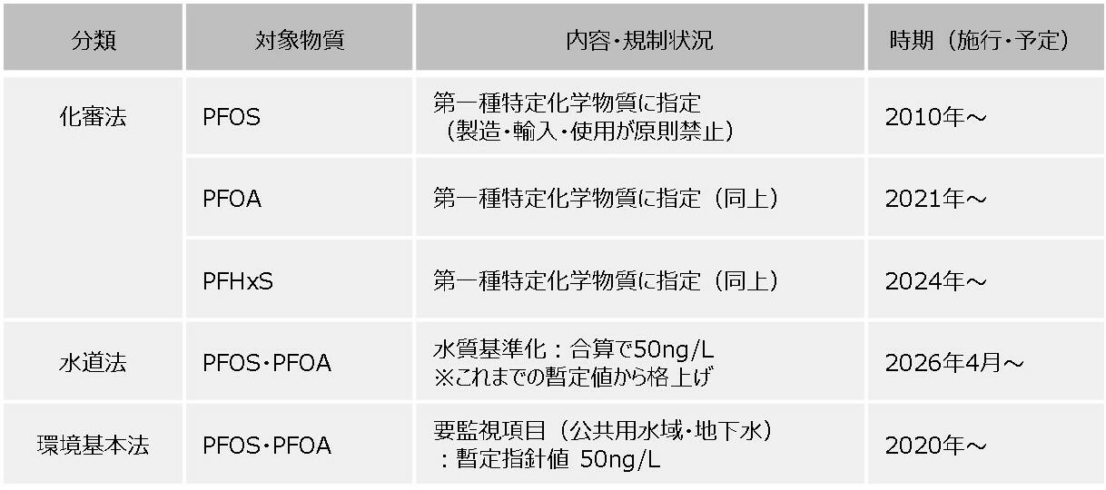 日本ではPFOS(ペルフルオロオクタンスルホン酸)とPFOA(ペルフルオロオクタン酸)そしてPFHxS(ペルフルオロヘキサンスルホン酸)の3種類について、以下に示すような法規制が施行されています。